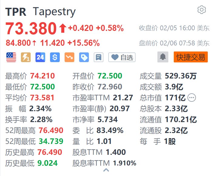Coach母公司Tapestry(TPR.US)盘前大涨超15.5%,报84.8美元,开盘后股价势将创下新高。