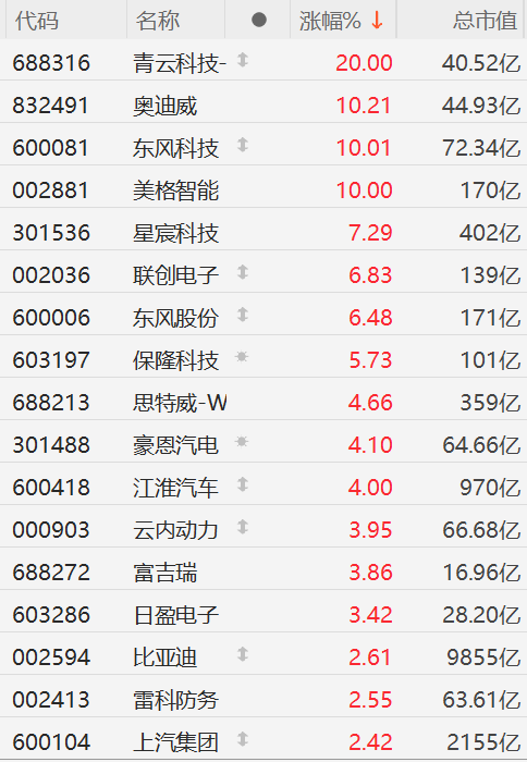 A股市场自动驾驶概念股集体走强,其中,青云科技20CM涨停,奥迪威涨超10%,东风科技、美格智能10CM涨停,星宸科技涨超7%,联创电子、东风股份涨超6%,保隆科技涨超5%,云内动力、日盈电子涨超3%,比亚迪涨超2%。消息面上,比亚迪董事长兼总裁王传福10日在比亚迪智能化战略发布会上宣布,比亚迪全系车型将搭载“天神之眼”高阶智驾,首批21款车型稍后上市。此外,比亚迪将推赛道无人驾驶。