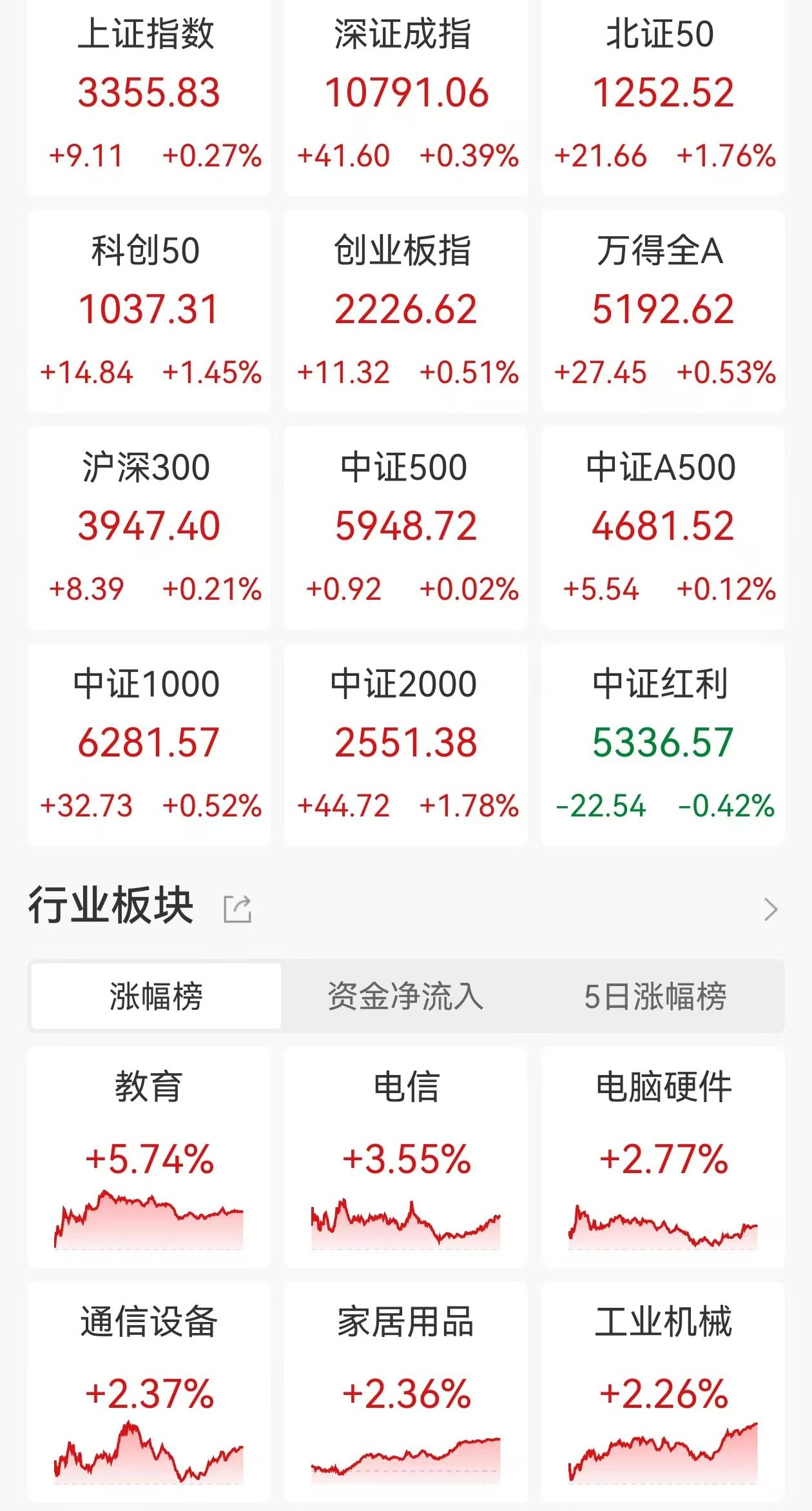 民营企业座谈会召开,A股三大指数今日小幅上涨,截至收盘,沪指涨0.27%报3355点,深证成指涨0.39%,创业板指涨0.51%。全天成交1.97万亿元,较前一交易日增量2270亿元,全市场近3700股上涨。
