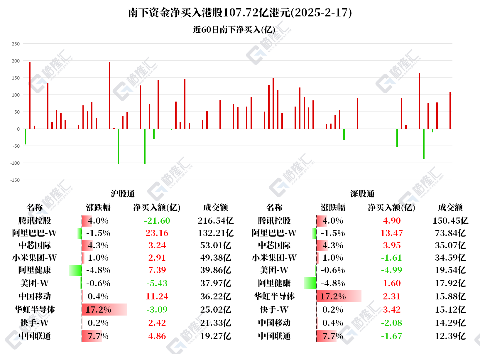 据统计,南下资金连续3日净买入阿里健康,共计14.6631亿港元;连续4日净买入阿里巴巴,共计129.91亿港元;连续6日净买入中国移动,共计35.8316亿港元。