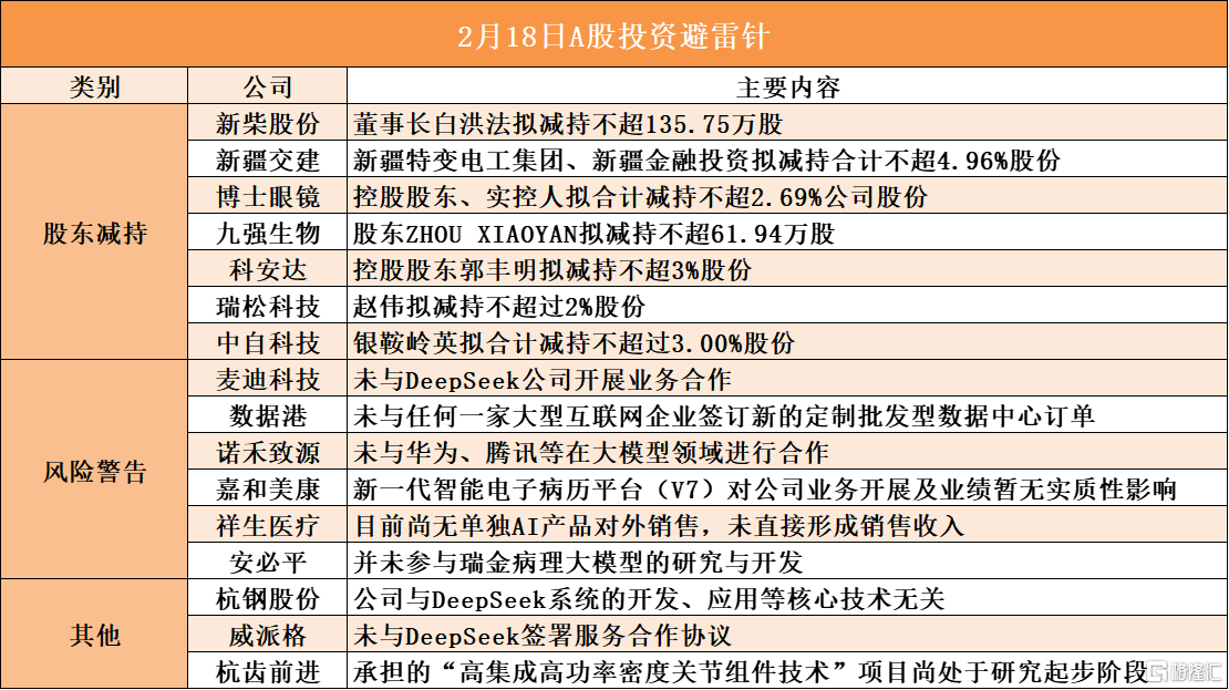 新疆交建股东新疆特变电工集团、新疆金融投资拟减持合计不超4.96%股份;博士眼镜控股股东、实控人拟合计减持不超2.69%公司股份;科安达控股股东郭丰明拟减持不超3%股份;中自科技股东银鞍岭英拟合计减持不超过3.00%股份;数据港未与任何一家大型互联网企业签订新的定制批发型数据中心订单;嘉和美康新一代智能电子病历平台(V7)对公司业务开展及业绩暂无实质性影响;祥生医疗目前尚无单独AI产品对外销售,未直接形成销售收入;威派格未与DeepSeek签署服务合作协议;杭齿前进承担的“高集成高功率密度关节组件技术”项目尚处于研究起步阶段
