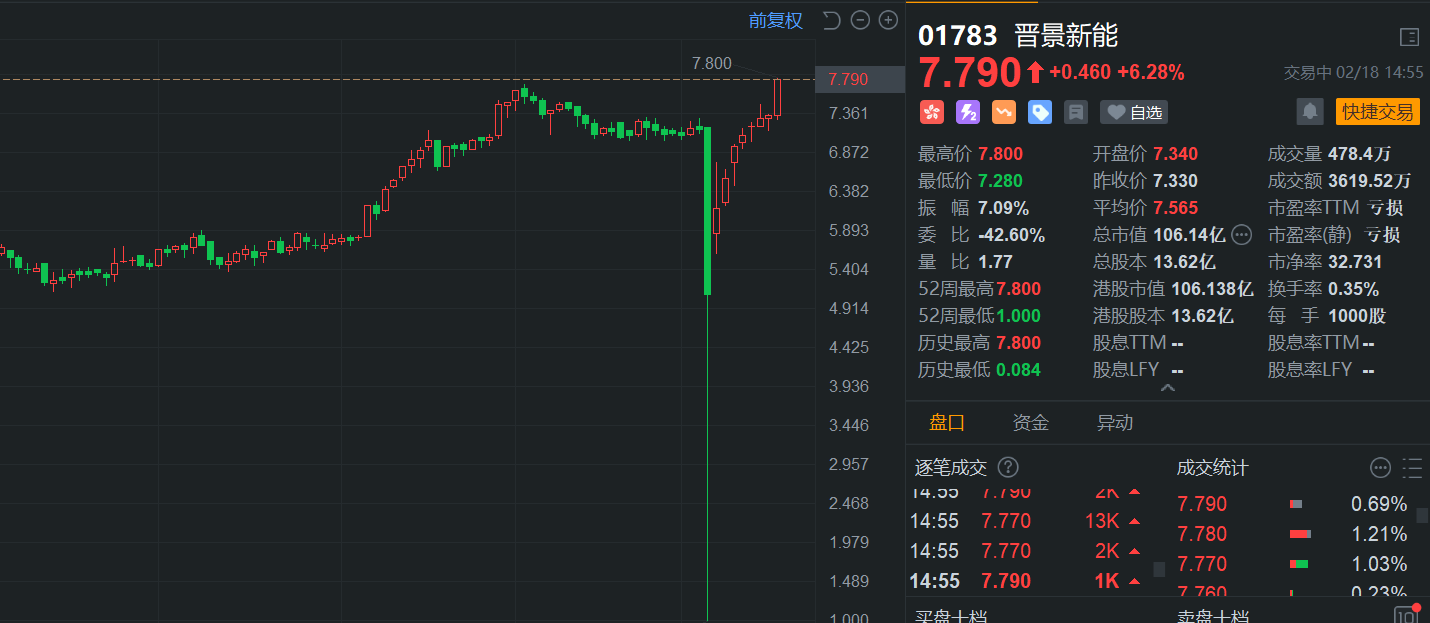 晋景新能(1783.HK)股价连续上涨,现涨超6%,报8港元刷新上市新高价,总市值超106亿港元。消息上,最新文件显示,Chun Yip International Investment Limited于2月11日再度增持,以每股均价6.57港元增持晋景新能38.1万股普通股股份,价值约250.32万港元。增持后,最新持股数目为5.48亿股股份,持仓比例由40.20%升至40.22%。