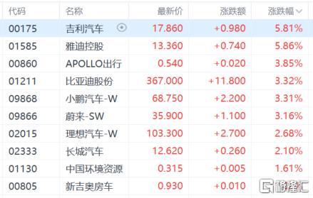 汽车股普涨,吉利汽车涨超5%,比亚迪股份、小鹏汽车、蔚来涨超3%,理想汽车、长城汽车等跟涨。