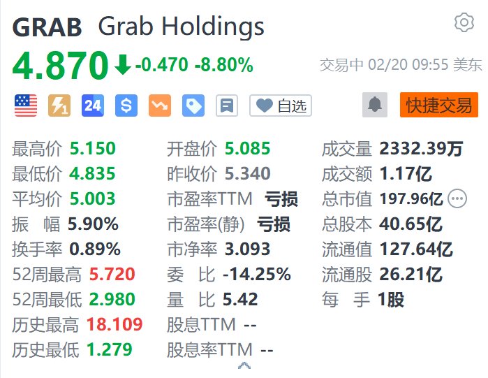 打车及食品配送服务平台Grab Holdings(GRAB.US)跌8.8%,报4.87美元。消息面上,Grab第四季度营收为7.64亿美元,按固定汇率计同比增长15%,而市场预期为7.576亿美元;调整后EBITDA为9700万美元,同比暴增173%。展望2025年,该公司预期收入将在33.3亿至34亿美元之间,区间中间值低于分析师平均预期的34亿美元。(格隆汇)