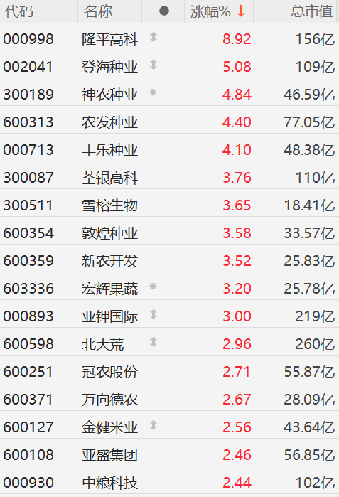 A股市场农业股集体高,其中,隆平高科涨近9%,登海种业涨5%,神农种业、农发种业、丰乐种业涨超4%,荃银高科、雪榕生物、敦煌种业、新农开发、宏辉果蔬、亚钾国际涨超3%,北大荒、謖击冠农股份、万向德农、金健米业、亚盛集团、中粮科技涨超2%。