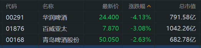 港股啤酒股普遍下跌,其中,华润啤酒跌超4%,百威亚太跌超3%,青岛啤酒股份跌2.6%。