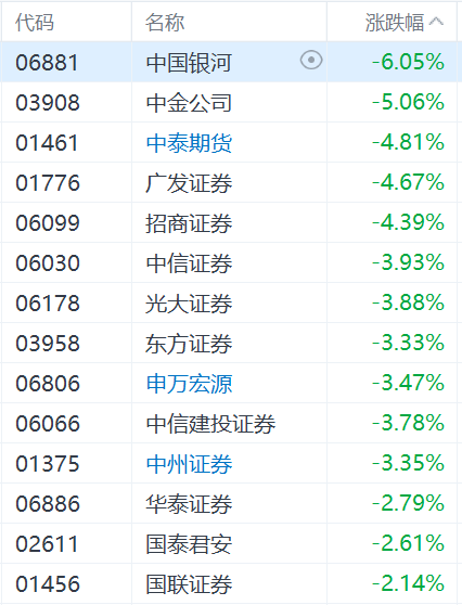 中金和中国银河否认合并传闻,股价双双下跌,连带中资券商板块集体下跌。中国银河跌6%,中金公司跌5%,广发证券、招商证券跌超4%,中信证券、光大证券、东方证券、申万宏源、中信建投证券、中州证券跌超3%。