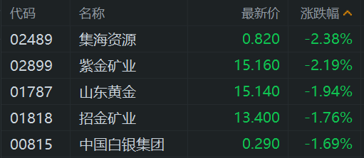 港股黄金股普跌,紫金矿业、山东黄金跌超2%,招金矿业、中国白银集团跌1.7%。