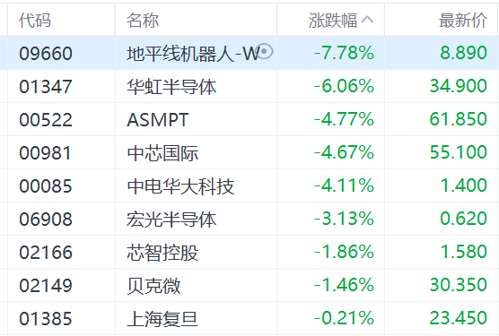 英伟达暴跌,拖累港股市场芯片股集体下跌。其中,华虹半导体跌6%,ASMPT、中芯国际、中电华大科技跌超4%。