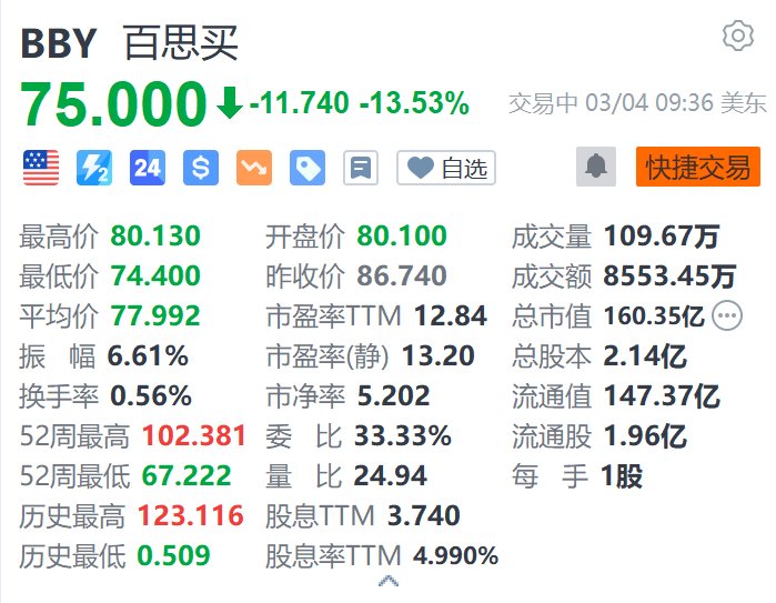 百思买(BBY.US)跌超13.5%,报75美元。消息面上,百思买公布截至2月1日止第四财季业绩,营收同比下跌4.8%至139.5亿美元,净利润同比下跌75%至1.17亿美元;经调整每股盈利2.58美元,高于市场预期的2.4美元。至于2026财年,公司预计全年收入为414亿至422亿美元,同店销售额按年增最多2%。该指引并未考虑近期或拟议的关税影响。公司首席执行官Corie Barry预期,随著美国总统特朗普新关税生效,美国消费者价格将会上涨。(格隆汇)
