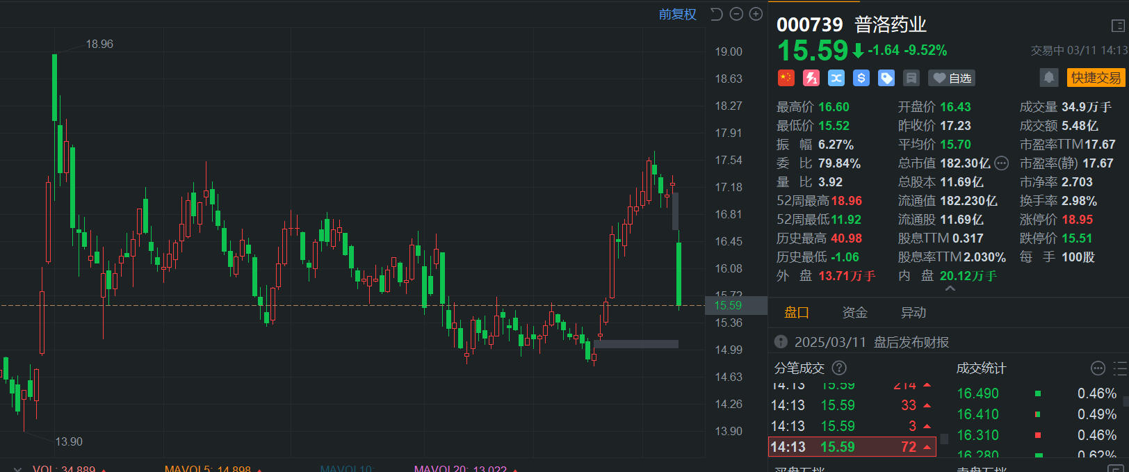 普洛药业(000739.SZ)大幅下挫逼近跌停,现报15.59元,总市值182亿元。消息上,公司昨日晚间公告称,24年实现营业收入120.22亿元,同比增长4.77%;净利润10.31亿元,同比下降2.29%。其中第四季度主营收入27.32亿元,同比下降8.15%;归母净利润1.61亿元,同比下降20.85%。值得一提的是,2024年普洛药业研发投入达到6.41亿元,同比增长2.66%,占营收比重为5.34%。(格隆汇)