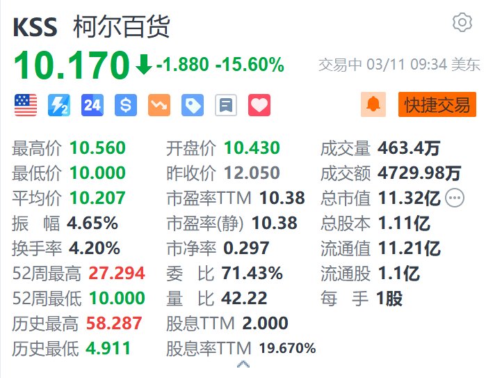 柯尔百货(KSS.US)跌15.6%,报10.17美元。消息面上,柯尔百货公布Q4业绩,净销售额51.75亿美元,同比下滑9.4%,略低于市场预期的51.8亿美元,可比销售额下滑6.7%;每股收益0.43美元,亦低于上年同期的1.67美元和市场预期的0.72美元。另外,该公司预计,2025年的同店销售额将下降4%至6%,远不及市场预期的下降0.9%;每股收益预计在10美分至60美分之间,而市场预期为1.23美元。(格隆汇)