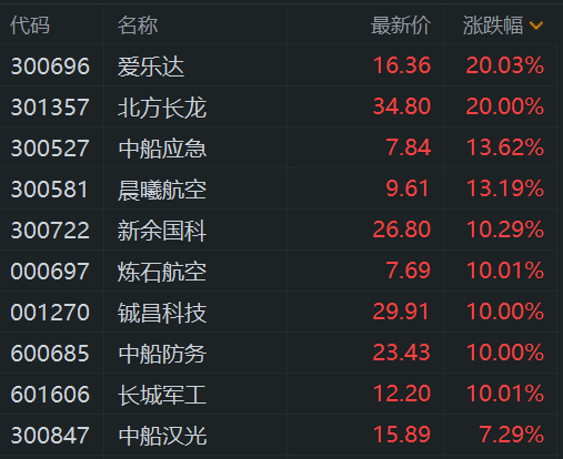 A股军工股盘初大涨,其中,北方长龙、爱乐维达封20cm涨停,新余国科、炼石航空、长城军工、中船防务涨停,中船应急、晨曦航空大涨超13%。