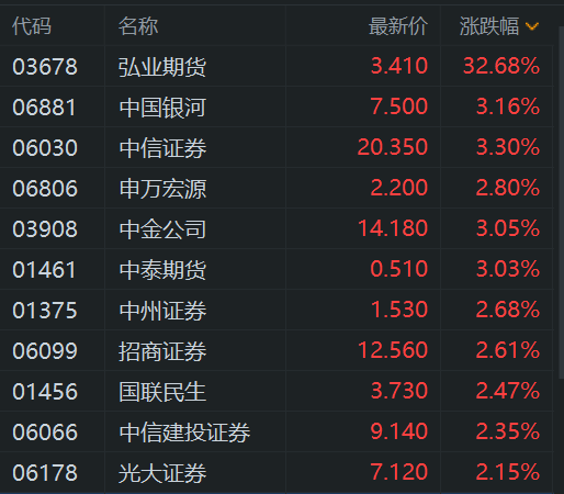市场迎重磅利好消息,大金融股全线走强,中资券商股集体上涨,尤其是弘业期货飙涨33%领衔,中国银河、中信证券、中金公司等权重均涨超3%。