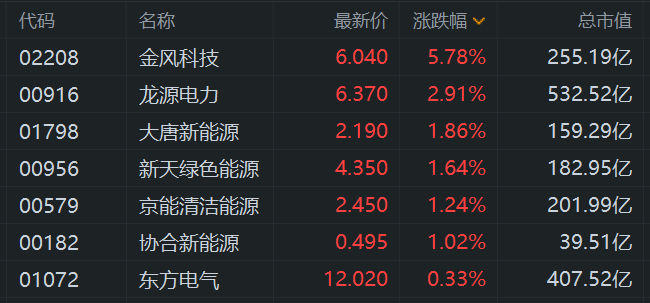 港股风电股普遍上涨,其中,金风科技涨近6%,龙源电力涨近3%,大唐新能源、新天绿色能源涨约2%,京能清洁能源、协合新能源涨超1%。