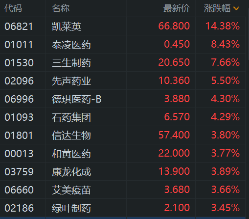港股药品股再度强势,其中,凯莱英涨超14%领先,泰凌医药涨8.4%,三生制药涨7.6%,先声药业、德琪医药、石药集团、信达生物、和黄医药、绿叶制药跟涨。