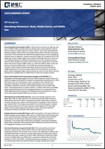 格隆汇中概研究院发布星竞威武(NIPG.US)更新报告《Monetizing Momentum: Music, Mobile Games, and Middle East》。星竞威武于2024年4月30日美股盘前公布了2024财年下半年的业绩。报告期内,公司实现总净收入4,590万美元,同比增长1.8%,主要得益于活动制作收入同比大幅增长92.6%。受战略投入加大影响,净亏损由2023年下半年的200万美元扩大至800万美元;经调整EBITDA从上一年同期的正100万美元下降至负730万美元。
