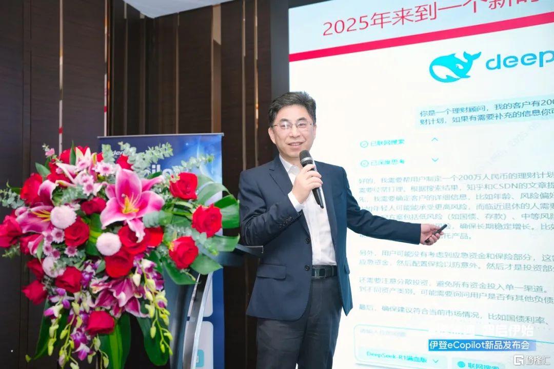 丁新云董事长在致辞中首先对莅临的嘉宾致以诚挚欢迎与感谢,并对过去22年伊登软件的成就进行了梳理,如香港主板上市、积累10000+客户等,持续领跑企业数字化转型赛道。她强调伊登以"AI+DATA"为战略核心,立志做领先的AI解决方案与云服务提供商。自2023年起,伊登就投入大量资源和人力进行AI应用产品的研发,2023年推出e-GPT,2024年推出易AI企业智能助手并商用化,25年打磨出旗舰产品Office AI eCopilot,大力拓展市场。