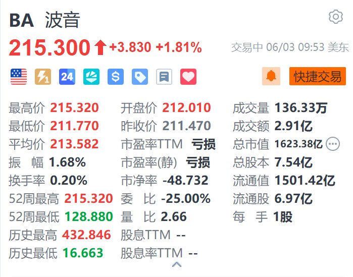 波音(BA.US)涨超1.8%,报215.3美元。消息面上,美银分析师Ronald Epstein指,波音飞机已成为近期美国贸易谈判中的“首选贸易工具”,预计这一趋势将持续。该行将波音的评级从“中性”上调至“买入”,并将12个月目标价从185美元大幅上调至260美元,为华尔街目前最高预测。(格隆汇)