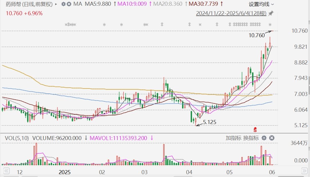 药师帮(9885.HK)跳空高开近7%,报10.76港元,股价创2024年3月以来新高。消息面上,药师帮宣布与越疆科技(2432.HK)达成战略合作,双方将围绕协作机器人及AI产品在医药领域的应用展开深度合作。