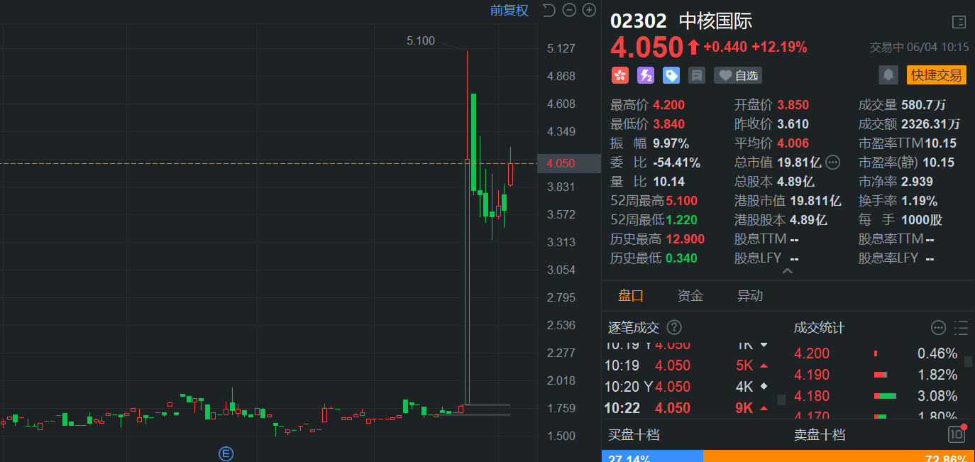 港股核电股大涨,其中,中核国际(2302.HK)一度大涨超16%,现报4.05港元,总市值20亿港元。