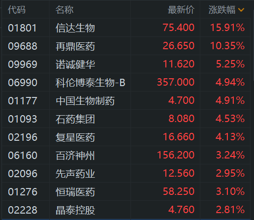 港股创新药概念股普遍强势,其中,信达生物大涨16%,再鼎医药大涨超10%,诺诚健华涨超5%,中国生物制药、石药集团、复星医药涨超4%,百济神州、先声药业、恒瑞医药涨超3%。