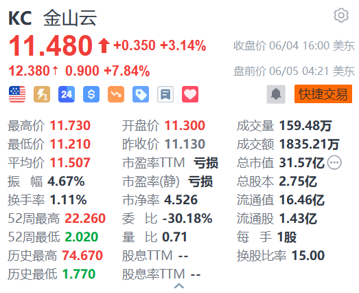 金山云(KC.US)盘前涨7.84%报12.38美元;金山云H股今日收涨近10%报6.57港元。消息面上,昨日国家能源局发布通知,要求在能源资源丰富地区协同规划算力与电力项目,探索“绿电聚合供应”模式,为算力中心降低用电成本提供路径,推动绿色算力产业链加速发展。此外,富瑞集团分析师Thomas Chong维持金山云买入评级,并将目标价从5.8美元大幅上调至16美元。(格隆汇)