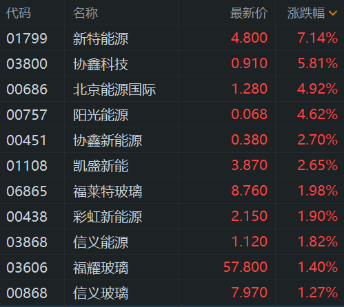 港股光伏股集体拉升,其中,新特能源涨超7%,协鑫科技涨近6%,阳光能源涨4.6%,协鑫新能源、福莱特玻璃、信义能源、福耀玻璃、信义玻璃均上涨。