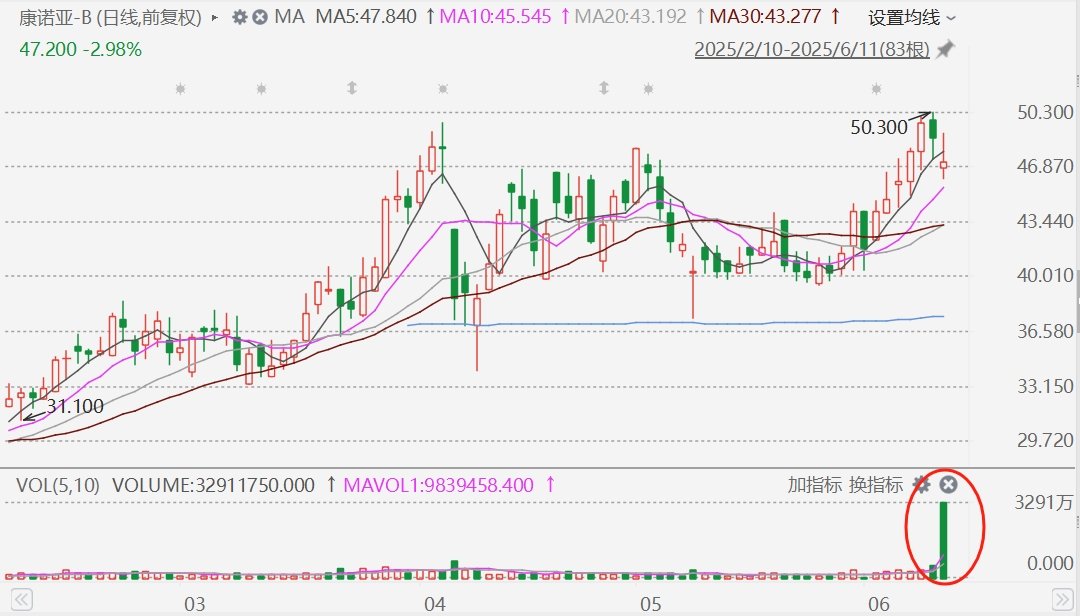 康诺亚-B(2162.HK)今日逆势下跌,盘中一度跌超5%至46.1港元,目前跌幅收窄至3%以内,截至目前成交额放大至15.2亿港元。