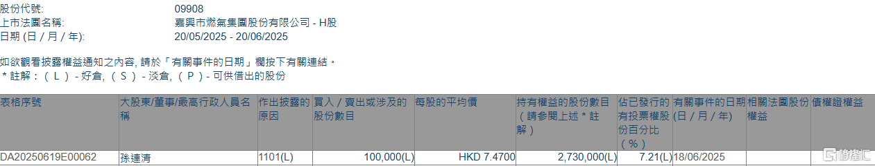 格隆汇6月20日丨根据联交所最新权益披露资料显示,2025年6月18日,嘉兴燃气(09908.HK)获主席兼执行董事孙连清在场内以每股均价7.47港元增持10万股,涉资约74.7万港元。