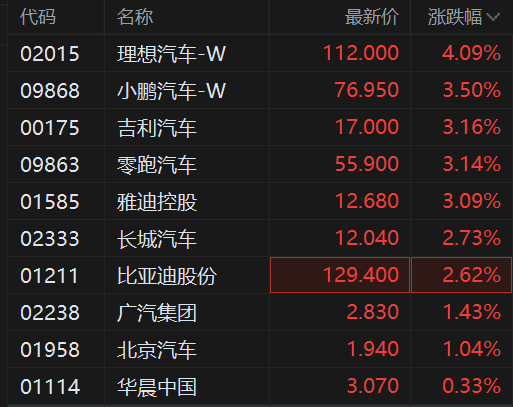 港股汽车股集体上涨,其中,理想汽车涨超4%,小鹏汽车、吉利汽车、零跑汽车涨超3%,长城汽车、比亚迪股份涨2.7%,广汽集团、北京汽车、华晨中国跟涨。