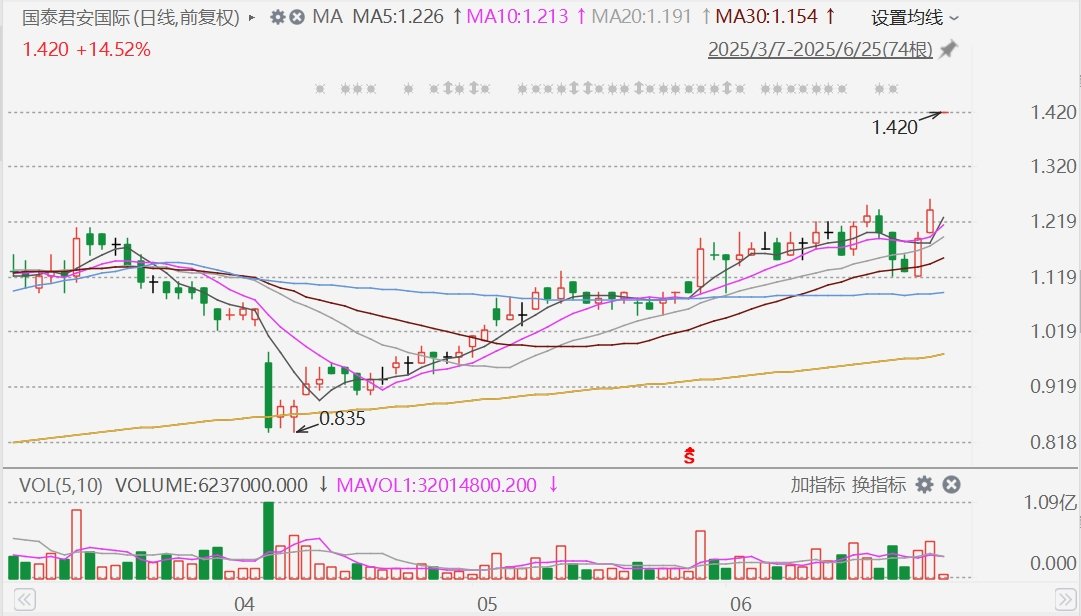 国泰君安国际(1788.HK)跳空高开14.52%,报1.42港元,股价创2024年10月以来新高。