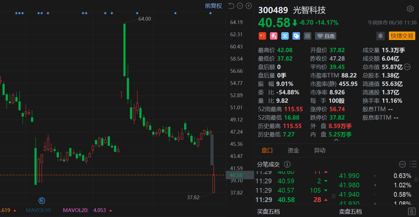 光智科技(300489.SZ)盘初一度跌停,午间收跌超14%报40.58元,总市值55.87亿元。消息上,光智科技上周五晚发布公告,公司决定终止发行股份及支付现金购买先导电科100%股份并募集配套资金的关联交易事项。“蛇吞象”收购先导电科事项突然按下了终止键。这也引发了市场的热议。值得注意的是,该公司股价于2024年10月14日至2024年10月23日连续8个交易日“20cm”涨停。(格隆汇)