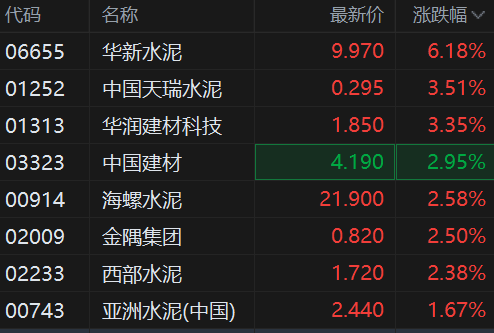 港股水泥股集体上涨,其中,华新水泥涨超6%,中国天瑞水泥、华润建材科技涨超3.3%,中国建材涨3%,海螺水泥、西部水泥、金隅集团涨2.5%。
