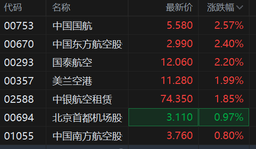 港股航空股普遍上涨,其中,中国国航、中国东方航空、国泰航空涨超2.2%,美兰空港涨2%,中国南方航空涨近1%。