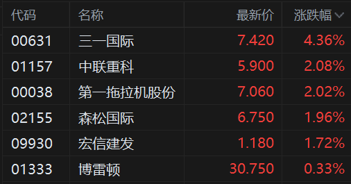 港股重型机械股普遍上涨,其中,三一国际涨超4%,中联重科、第一拖拉机股份、森松国际涨2%。
