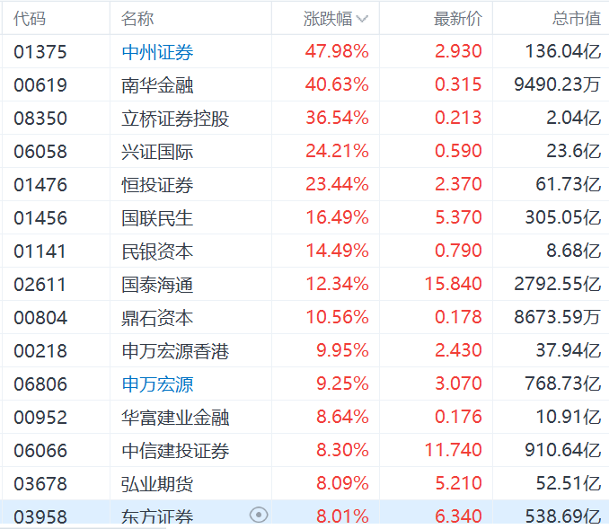 其中,中州证券一度涨75%,南华金融涨62%,立桥证券控股涨60%,兴证国际、恒投证券涨超20%,国联民生涨16%,民银资本涨14%,国泰海通涨12%,鼎石资本、申万宏源香港涨10%,申万宏源涨9%,华富建业金融、中信建投证券、弘业期货、东方证券涨超8%,招商证券、光大证券涨超5%。