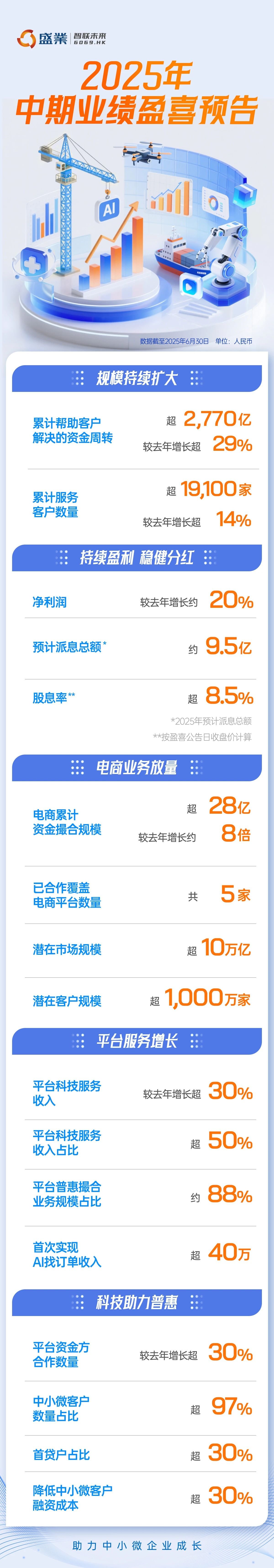 平台规模稳健增长——截至2025年6月30日,盛业平台累计帮助客户解决的资金周转超2770亿元,同比增长超29%,累计服务客户数量超19100家,同比增长超14%;