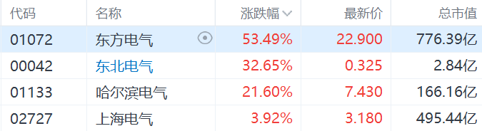 港股市场电力设备股集体飙升,其中,东方电气涨53%,东北电气涨32%,哈尔滨电气涨21%,上海电气涨近4%。