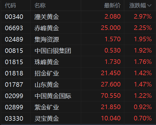 港股黄金股普遍上涨,其中,潼关黄金涨约3%,赤峰黄金涨超2%,中国白银集团、珠峰黄金涨约2%,招金矿业、山东黄金涨1.5%,中国黄金国际涨超1%,紫金矿业、灵宝黄金涨约1%。