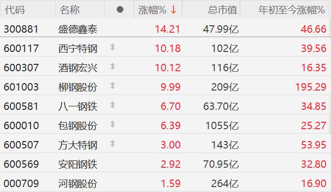 A股市场钢铁股继续活跃,其中,盛德鑫泰涨超14%,西宁特钢、酒钢宏兴、柳钢股份涨停,八一钢铁、包钢股份等跟涨。消息面上,在日前举办的第十届陕晋川甘钢企高峰论坛上,与会钢企代表达成“强化自律控产”的共识。大家认为,落实好中央提出的破“内卷”要求,加强行业自律,将为实现区域钢铁产业有序、有质、有效发展发挥重要作用。中国钢铁工业协会副会长骆铁军表示,上半年,钢铁行业实现利润的一部分来源于焦煤等燃原料的价格下跌,钢铁企业要清醒地认识下半年需求未发生根本性变化的现实,加强行业自律。分析人士指出,钢铁交易逻辑已从炉料让利为主转向供给收缩与炉料下跌共同改善行业景气度。