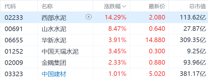 港股水泥股集体走强,其中,西部水泥涨超14%,山水水泥涨超8%,华新水泥、中国天瑞水泥涨超3%,金隅集团涨超2%。消息面上,西部水泥发盈喜,预料截至今年6月底止半年公司拥有人应占溢利同比上升80%至1倍;去年同期溢利约3.87亿元。公司表示,上半年盈利增加,主要因为期内海外水泥收益大增;平均售价增加及销售成本减少,中国的水泥销售毛利增加约48%;集团因销售物业而录得溢利约9770万元,而去年同期没有相关溢利;就商誉及其他非流动资产确认减值亏损拨回约1.15亿元,而去年并无录得有关拨回。