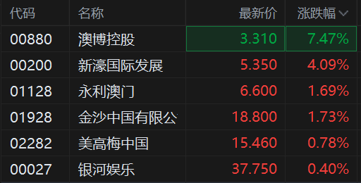 港股濠赌股拉升上涨,其中,澳博控股一度涨近12%表现抢眼,且刷新阶段新高价,新濠国际发展涨超4%,永利澳门、金沙中国涨近2%,美高梅中国、银河娱乐均上涨。