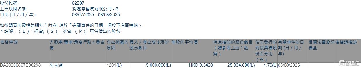 格隆汇8月8日丨根据联交所最新权益披露资料显示,2025年8月5日,润迈德-B(02297.HK)遭股东吕永辉在场内以每股均价0.342港元减持500万股,涉资约171万港元。