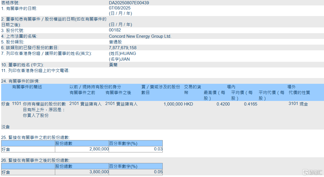 格隆汇8月8日丨根据联交所最新权益披露资料显示,2025年8月7日,协合新能源(00182.HK)获独立非执行董事黄简在场内以每股均价0.4165港元增持100万股,涉资约41.65万港元。