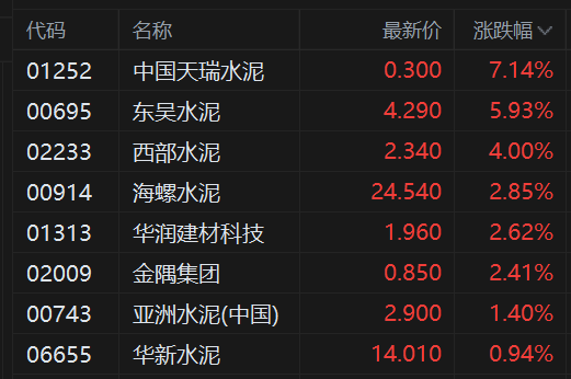 港股水泥股普遍拉升上涨,其中,中国天瑞水泥涨超7%,东吴水泥涨6%连涨6日,西部水泥涨4%并且录得7连升,海螺水泥、华润建材科技涨近3%,金隅集团、亚洲水泥、华新水泥跟涨。