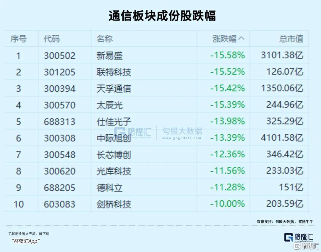 具体来看,通信板块波动异常剧烈,光模块(CPO)昨天大涨后今天却大幅下跌。新易盛、中际旭创、天孚通信这三大热门股领跌。剑桥科技、长飞光纤、东山精密、华工科技10cm跌停。