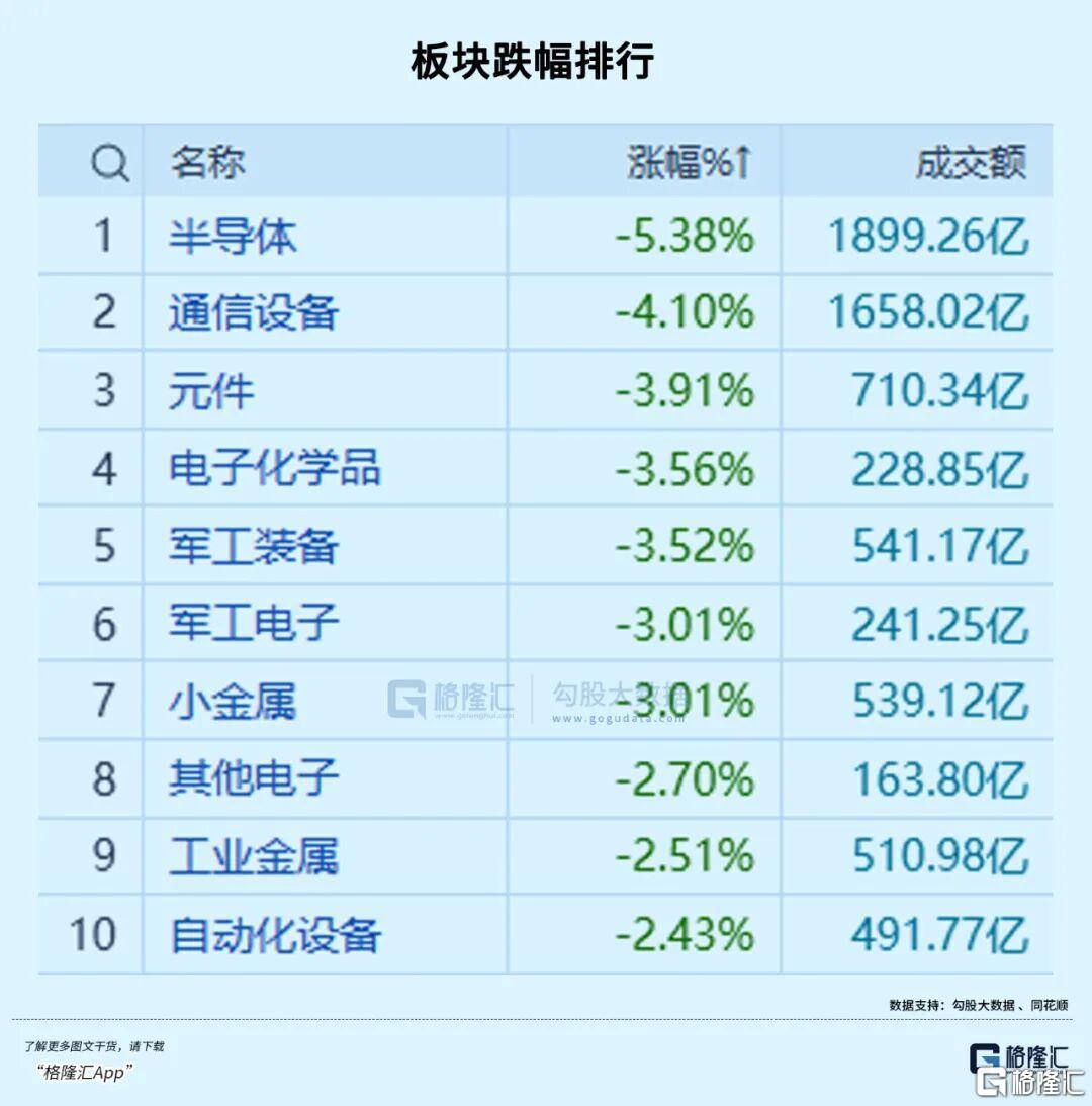 全市场近3000只个股下跌,同样大幅重挫的还有半导体、电子元器件、军工、有色金属等前期高标阵地,市场开启调整,可谓一个板块都没放过。