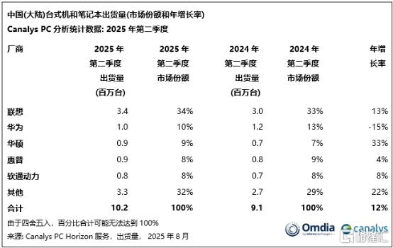 2025年第二季度,联想继续稳居中国PC市场领导地位,台式机和笔记本电脑出货量达到340万台,同比增长13%,市场份额增长至34%。一直以来,联想凭借丰富的产品线、可靠的产品质量以及广泛的销售渠道,在国内PC市场占据着领先地位。