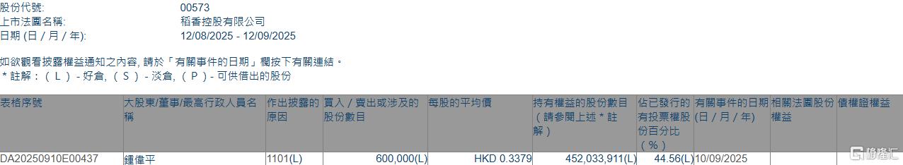 格隆汇9月12日丨根据联交所最新权益披露资料显示,2025年9月10日,稻香控股(00573.HK)获执行董事、主席及行政总裁钟伟平在场内以每股均价0.3379港元增持60万股,涉资约20.3万港元。